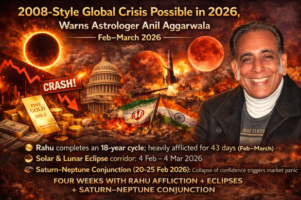 A 2008-style global financial and geopolitical crisis may resurface in February–March 2026, according to advanced Mundane Astrology analysis, warns Astrologer Anil Aggarwala. The danger arises from a rare convergence of eclipse triggers, Rahu’s 18-year cycle, and the Saturn–Neptune conjunction, all activating within a compressed 30-day corridor.