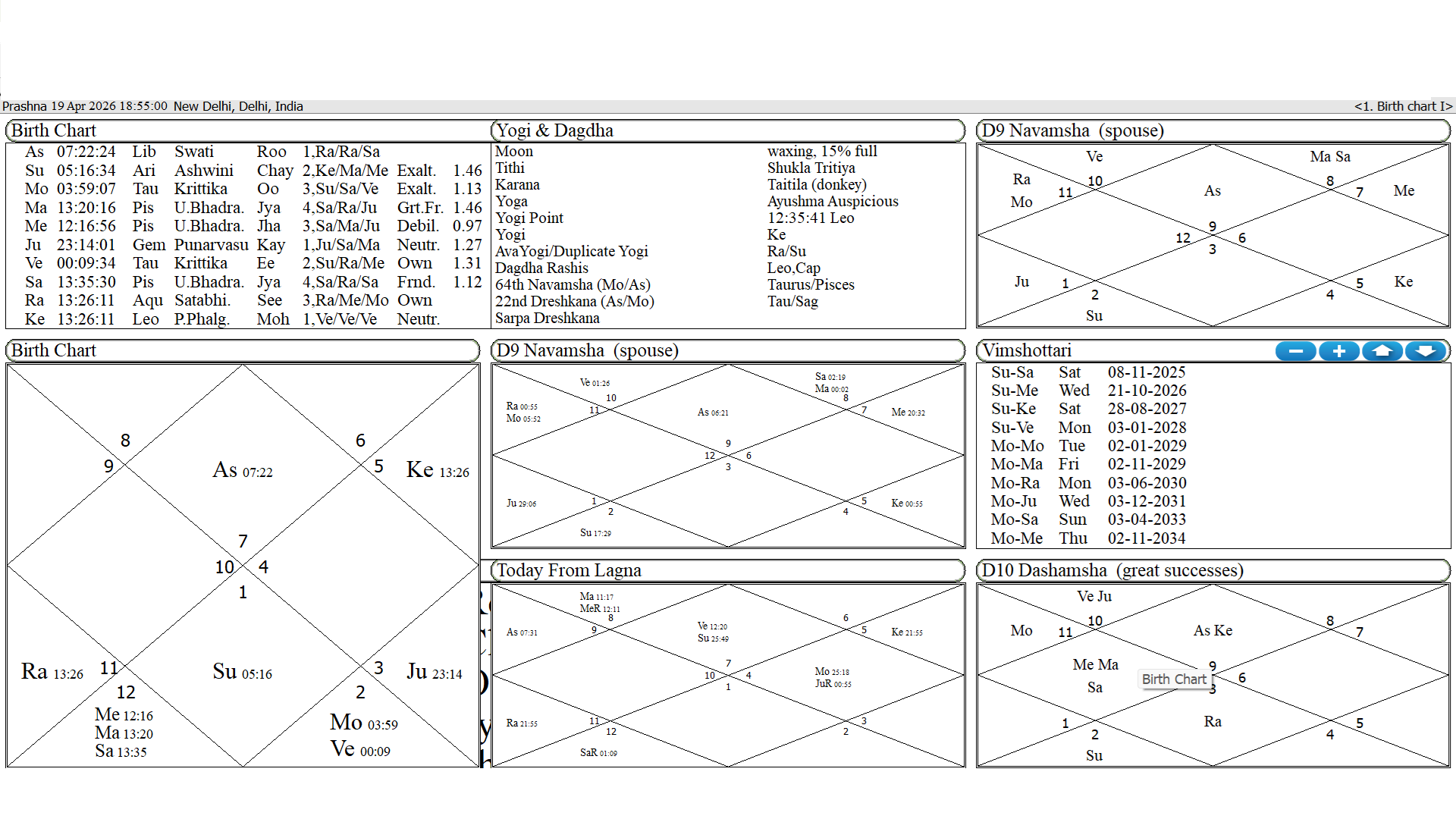 - BJP (Gemini Lagna) under Moon Dasha, with Mars aspecting a debilitated Moon in the 6th house