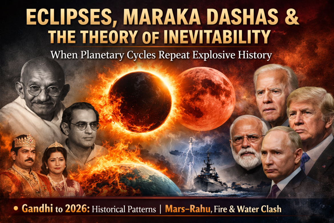 When eclipses activate the 1/7 or 4/10 axis of national charts, and when Maraka Dashas operate simultaneously, Shri K.N. Rao’s Theory of Inevitability suggests that dormant karmas ripen rapidly.