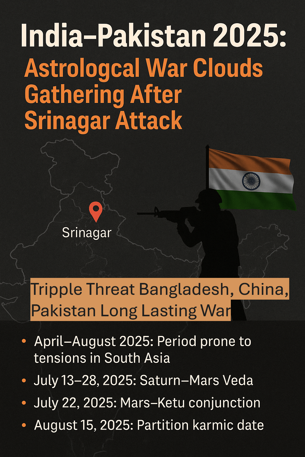 India is entering a prolonged phase of geopolitical strain. Multiple malefics afflicting houses of diplomacy, borders, and foreign policy, combined with hostile dashas in neighbouring countries, suggest not just a temporary flare-up but a long war-like scenario. Strategic patience, military readiness, and diplomatic alertness will be crucial through 2025–2026.