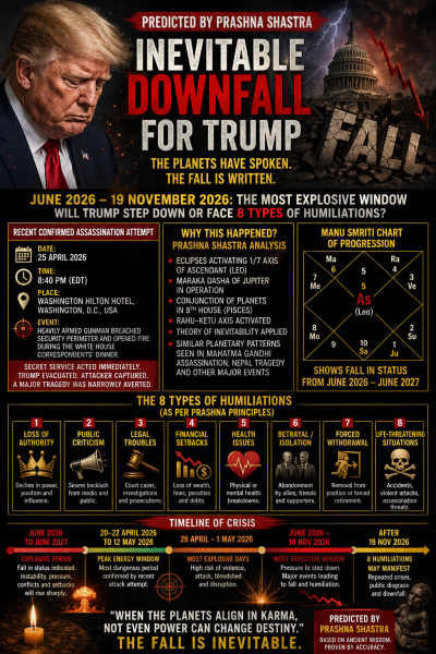 Well in advance, I had clearly predicted that the period between 20th–22nd April 2026, extending up to 12th May 2026, and especially the 28th April–1st May window, would represent a peak of dangerous planetary energies, capable of manifesting in extreme events, including threats to high-profile leaders. I had crystal clear predicted that Trump will face 8 type of Humiliations Parallel Mahatma Gandhi, Nepal Tragedy, Down Fall of Liz Truss, John F Kennedy took Place. when Eclipses fell on the natal Mars similar to Trump now between 17th Feb, 3rd March 2026. As per Prashna of the 25th April 2026 when the attempt took place the Planetary positions indicate 8 type of humiliations again If he is in Power, The Progression chart by Manu Smriti indicates most challenging Period for Trump from the June 2026 to June 2027 and indicates a fall in Status strongly