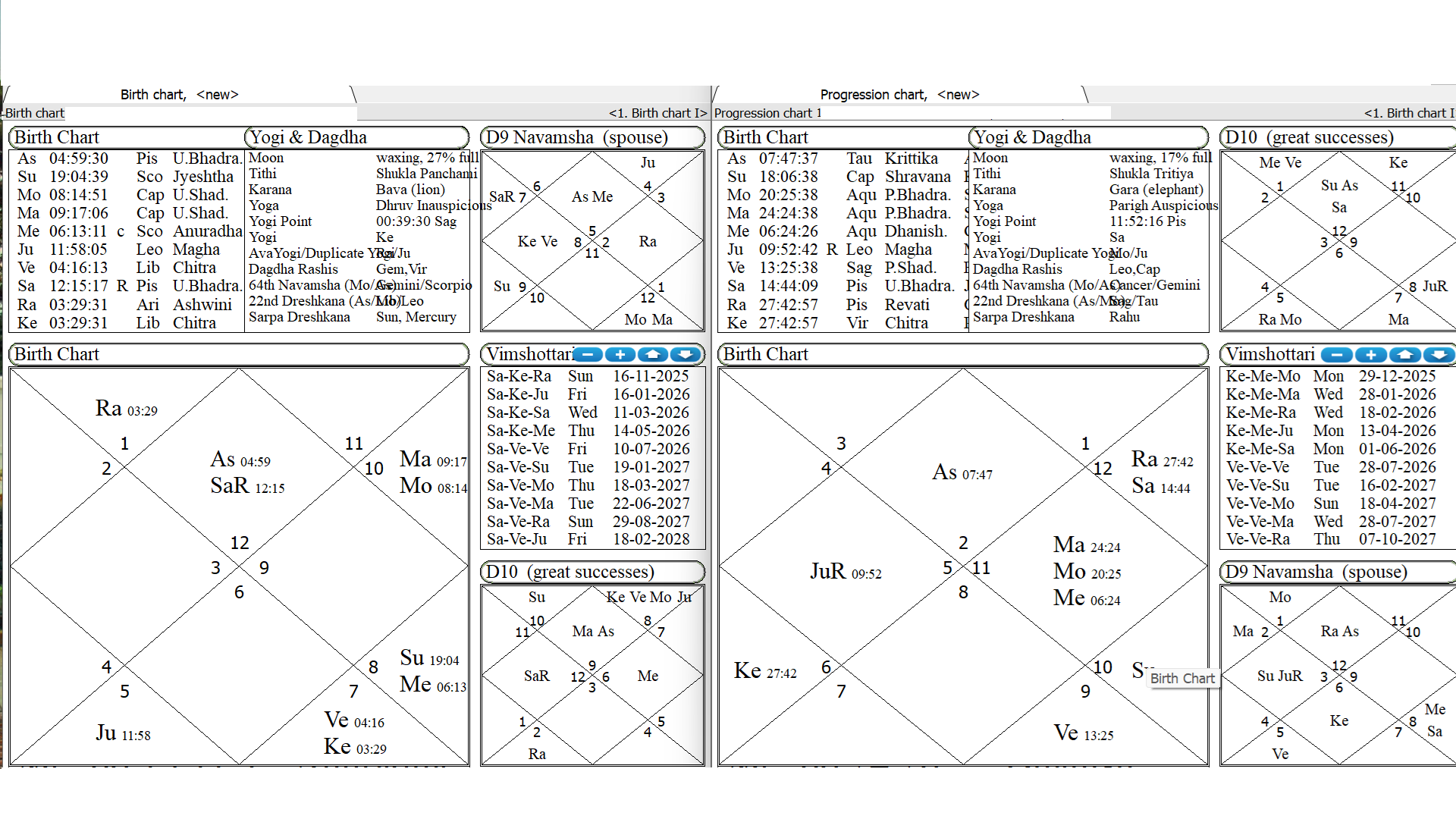 One of the most powerful yet least understood predictive tools in classical South Indian astrology is the Manu Smriti Progression Chart. When applied alongside the Natal Chart, and judged through sensitive arcs, exact degrees, and classical significations, it has the capacity to pinpoint events to the exact date—not merely the period.