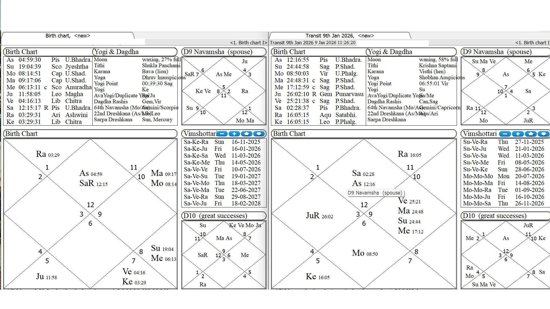 - Now apply the Transit of the Planets of the 9th Jan. 2026 over the 8th house of change over the MCL of the 10th house of the Natal chart Venus—– We reach the the same conclusion as above. See the Navamsha and the Dashamsha of the Progression chart they indicate rise in Status