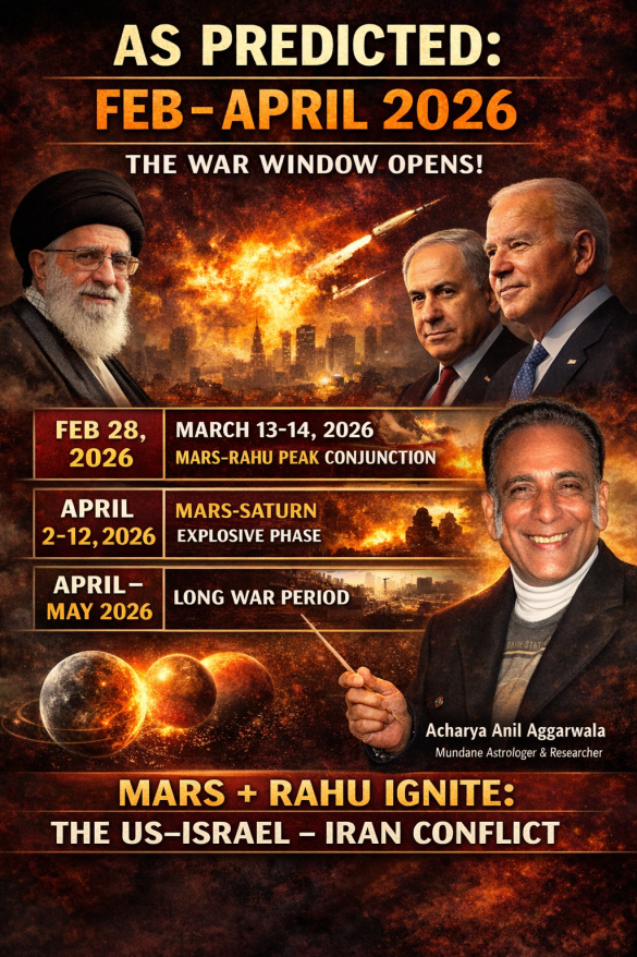 “On 28 Feb 2026, the US–Israel strike on Iran activated the exact Mars–Rahu war window I predicted months earlier. The peak of aggression is yet to come on 13–14 March, with an even more explosive period between 2 April–12 May 2026 when Mars joins Saturn. This conflict is unlikely to end quickly.”
