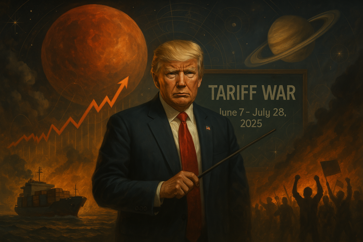 Astrological breakdown of Trump’s aggressive trade stance—“Pay Tariffs or Don’t Trade”—and how the planetary transits are perfectly aligned with this bold escalation, especially between June 7 and July 28, 2025.