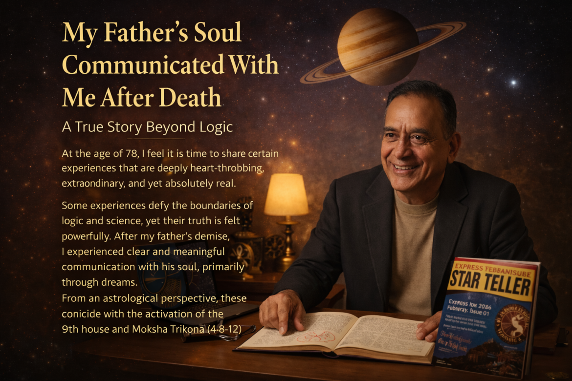 Divine Connection and Intuition Since those days after 2007, my intuition power has grown manifold, specially communication with nature. In this regard I have also written Articles in “The Express Star Teller Hidden Prophetic Significance Of Events” in the Dec. 2019 edition of the ‘EXPRESS STAR TELLER’ Page 43-44, Heart Throbbing Predictions By Shakun and Prashna Jyotish for Purchase of a Car in Dec. 2022 edition. I often foresee events, and what I perceive in meditation or dreams manifests later in real life. This sacred journey convinced me that the universe communicates with those, who keep faith, purity, and gratitude toward their ancestors and nature. As astrology reveals, our Pitrus never leave us; they live through our karmic charts, guiding and correcting our paths. This true story is a testament that souls never die. My father’s spirit continues to bless me and guide my predictions. Every fulfilled forecast, every accurate insight, every intuition …I owe it all to the unseen hand of my late father and to the eternal science of Jyotish and Almighty.